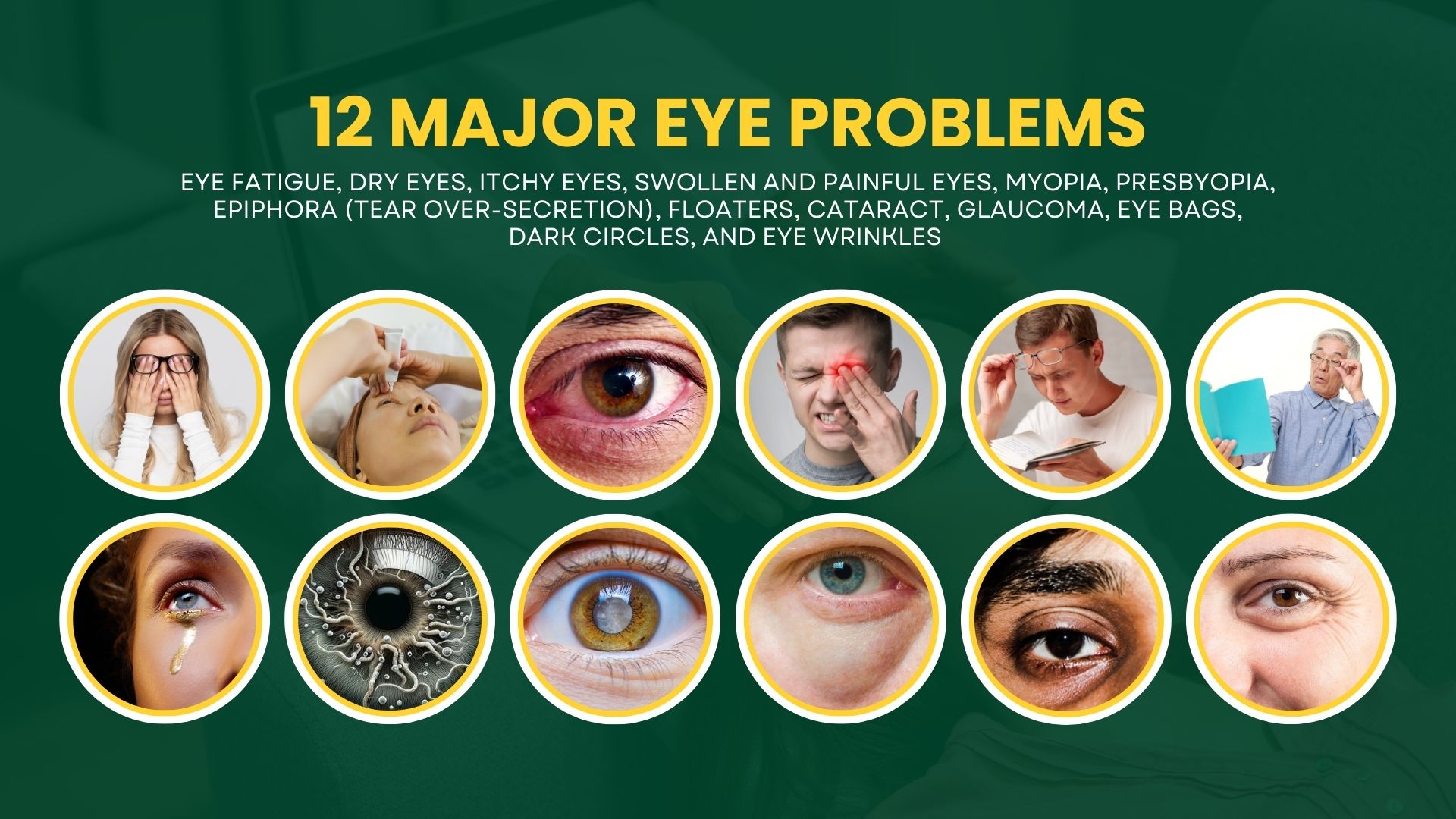 Eye Fatigue, Dry Eyes, Itchy Eyes, Swollen and Painful Eyes, Myopia, Presbyopia, Epiphora (tear over-secretion), Floaters, Cataract, Glaucoma, Eye Bags, Dark Circles and Eye Wrinkles.