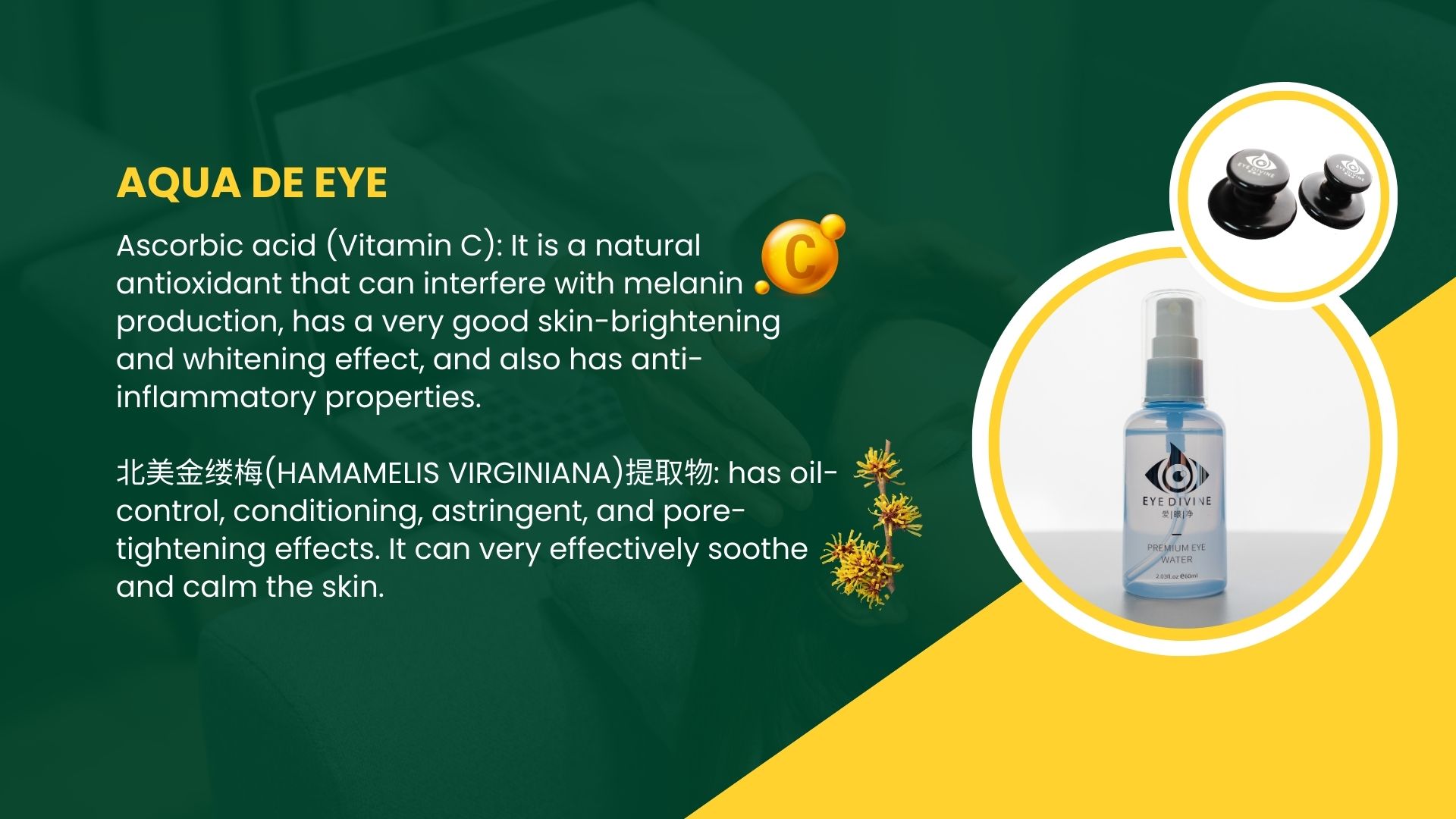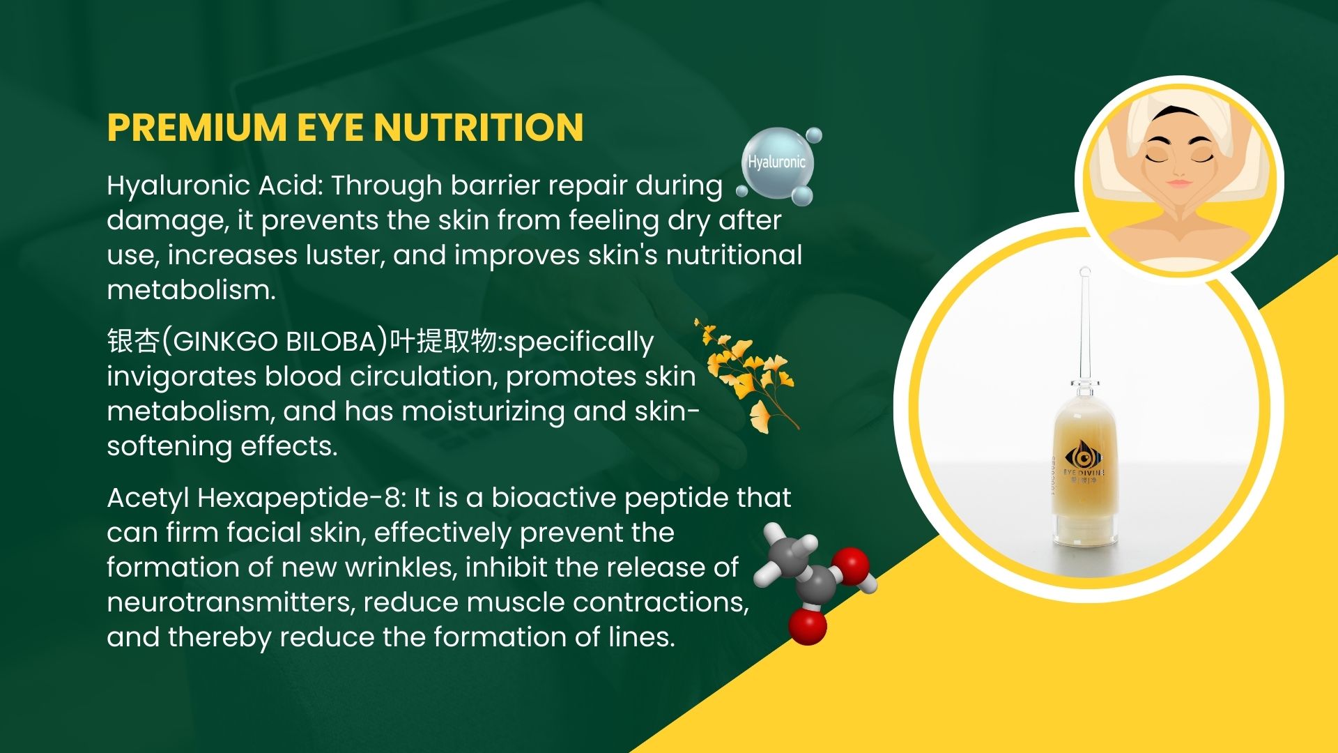 PRODUCT INGREDIENT FUEATURES – disperses nodules and detoxifies, hydrates and moisturizes, anti oxidation, combats blue light.